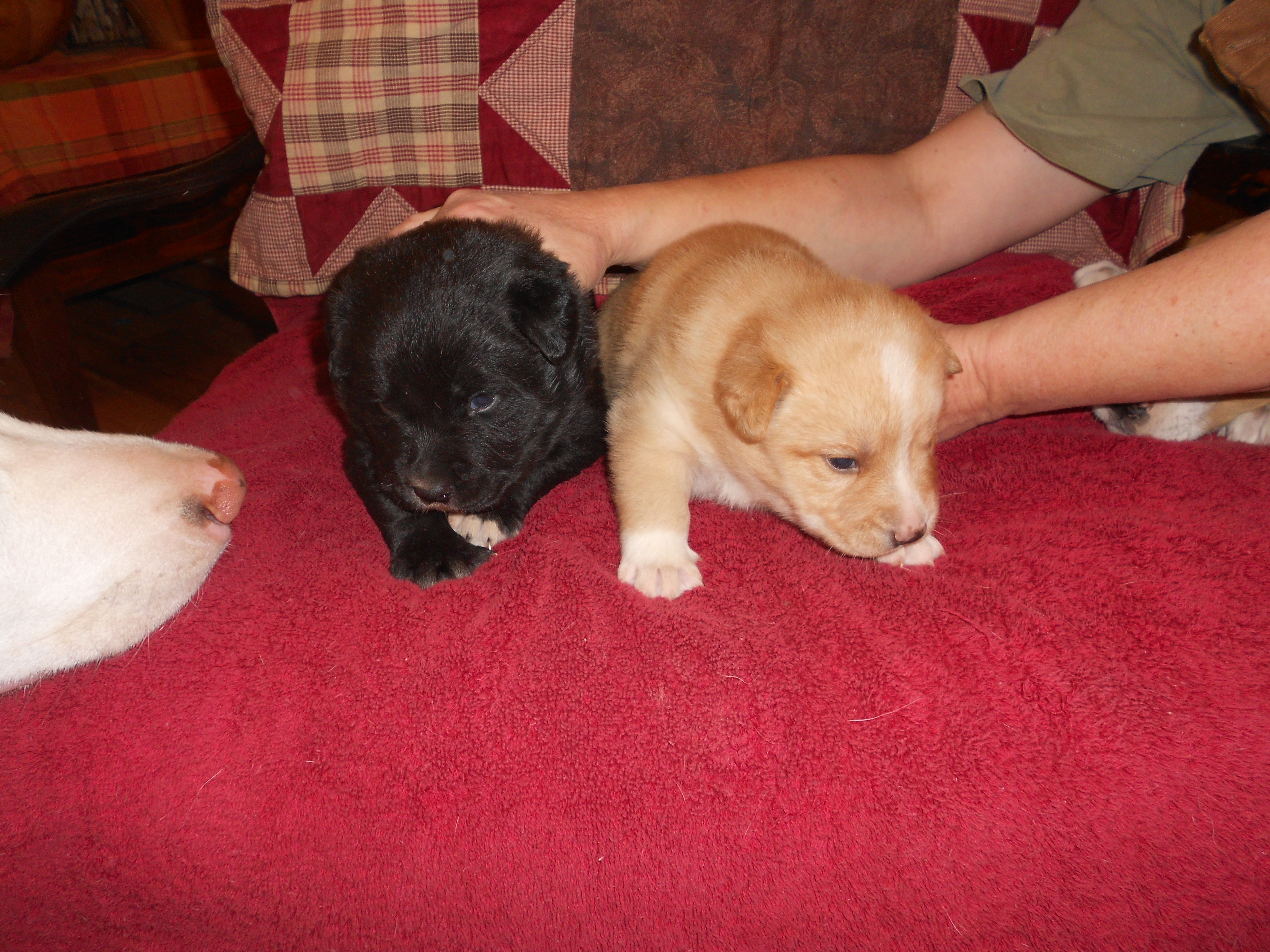 What breed is she? Katie is a mystery to us as far as the breed goes.  She is short-legged and very stocky built.  I just thought she was over fed, but it appears her puppies have all the same traits.  They are short-legged and will have a dense undercoat, and they are very plump. Actually, one looks like a bulldog –but I doubt if that is actually their breed.  Regardless–they are adorable and have started eating and drinking on their own.  They still have a couple weeks to go before they can be adopted–so it should be close to Christmas.  The picture was taken a week ago—Will share another updated on soon.
