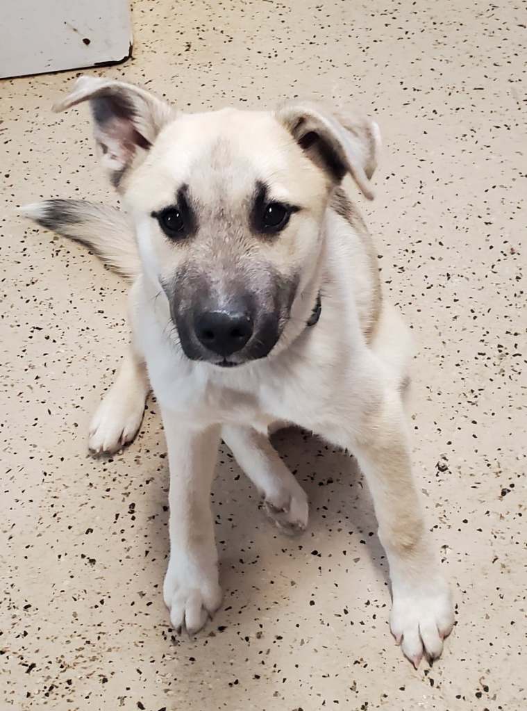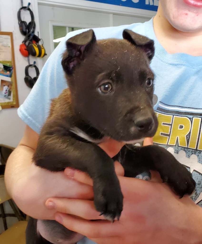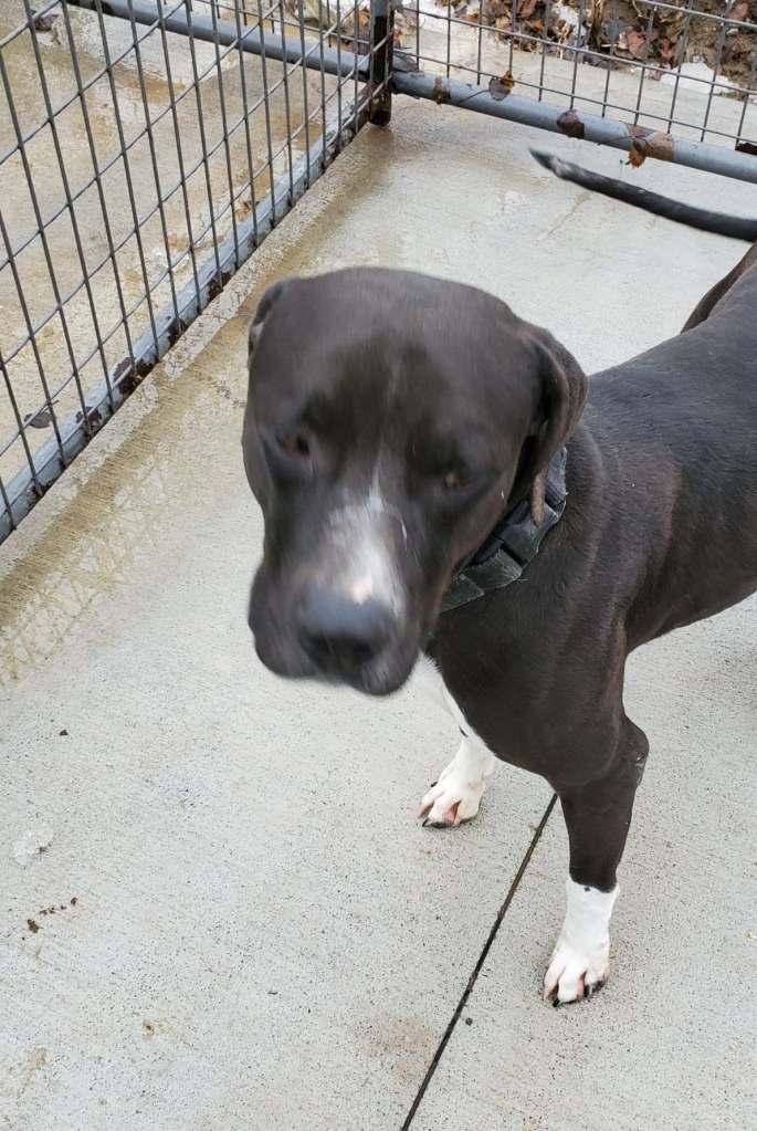 Well, he is a handsome black dog with floppy years. Yes, he is going to be a big boy. He is a Great Dane mix. He needs a home that is active, so he can get the exercise he needs. He too, could use some training and at this time should probably be the only dog in the family. At least no other males. He is still under a year.