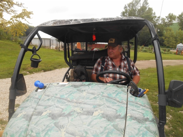 This is Max on his adventure. He needed help to get on the seat, but he has fun outside with the dogs and following everyone around.